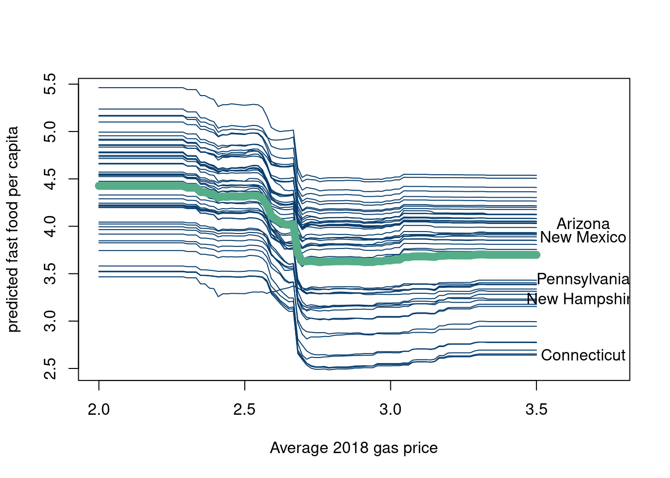 geom_line(col='#073d6d')+stat_summary(aes(x=`gas price`, y=fastfood10k, group=F),fun = "mean", colour = "#55AD89", size = 2, geom = "line")+theme_minimal())The blue lines are the conditional expectations for every state when holding every covariate constant but changing the price of gasoline in that state. The y axis is the predicted response for that state (in terms of fast food restaurants per 10,000 people). The green line is the average predicted response for a given “hypothetical” gas price across the 50 states and is called the partial dependence plot. Again, why gas price as the covariate we are varying while fixing the others is a good question, as is the question of whether you could feasibly vary the gas price without changing the other features (doubtful).