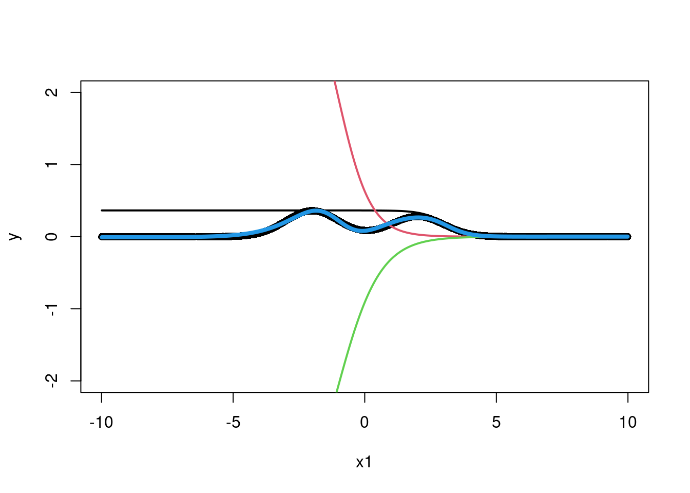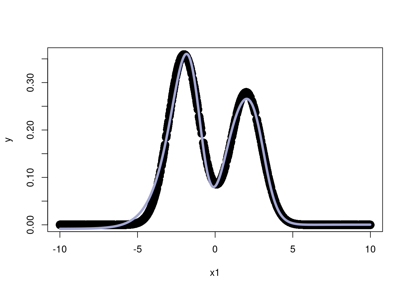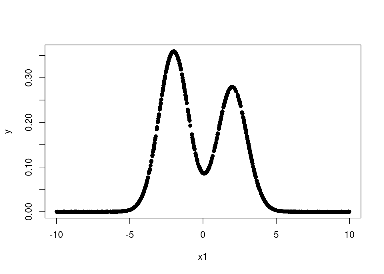 y = 0.9*dnorm(x1, -2, 1)+0.7*dnorm(x1, 2, 1)