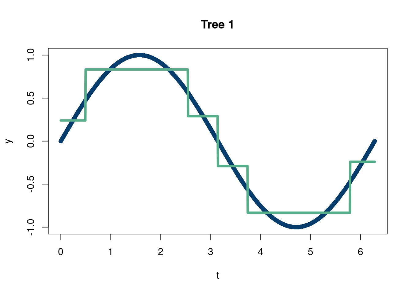 The other branch of ensemble tree methods that falls into the simple but brilliant category is “boosting”. Boosting, in terms of decision trees, refers to the concept of building a decision tree as the addition of many small trees (by small we mean trees that do not have too many bottom nodes). This is done by passing the residuals (the difference between the true values of \(y\) and the predicted values in the tree nodes which equal the mean of all the observations in the bottom leaf nodes) of each small tree as the input to the next tree in the sequence. The following code illustrates summing trees through boosting.