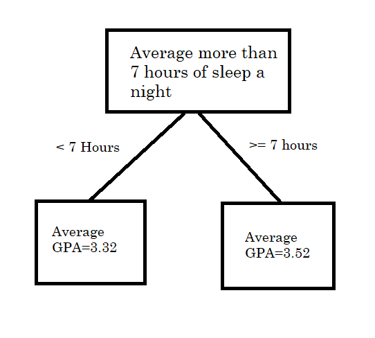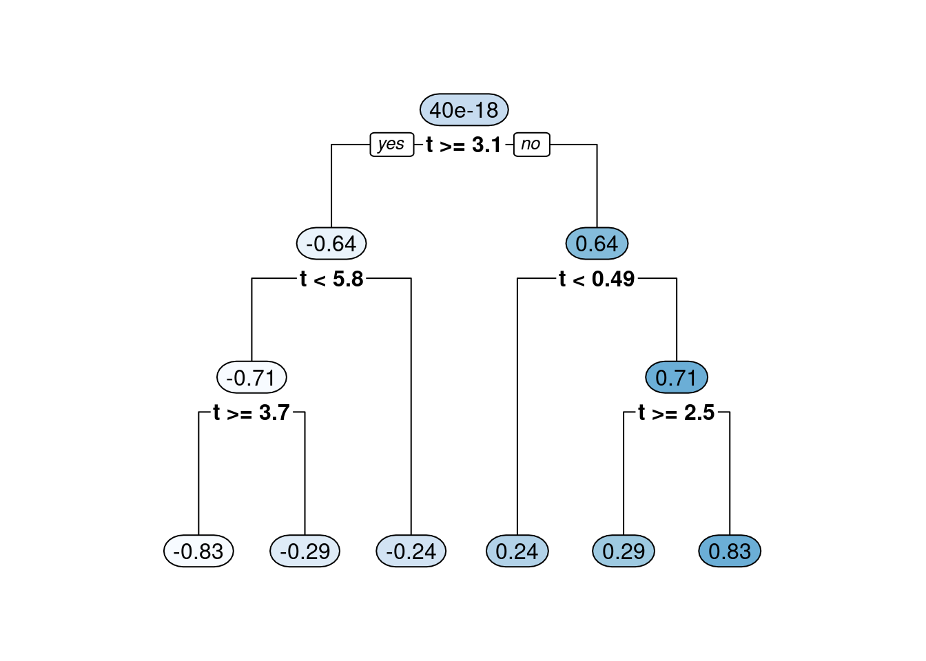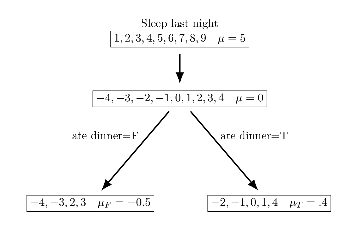For example, following Murphy (2012), consider a decision tree with a single split. If \(x>\text{cutoff point}\), we assign \(f(x)\) the mean of the \(y\) response values in that region,which we call \(\beta_{1}\). If \(x\leq\text{cutoff point}\), then we assign it the mean of the \(y\) response values in that region, called \(\beta_{2}\). For a tangible example, say our input variable is sleep hours and our outcome is GPA of students at a high school. An example would be the tree splitting students with more than 7 hours of sleep a night and their GPA vs students with less than 7 hours of sleep a night and their GPA.