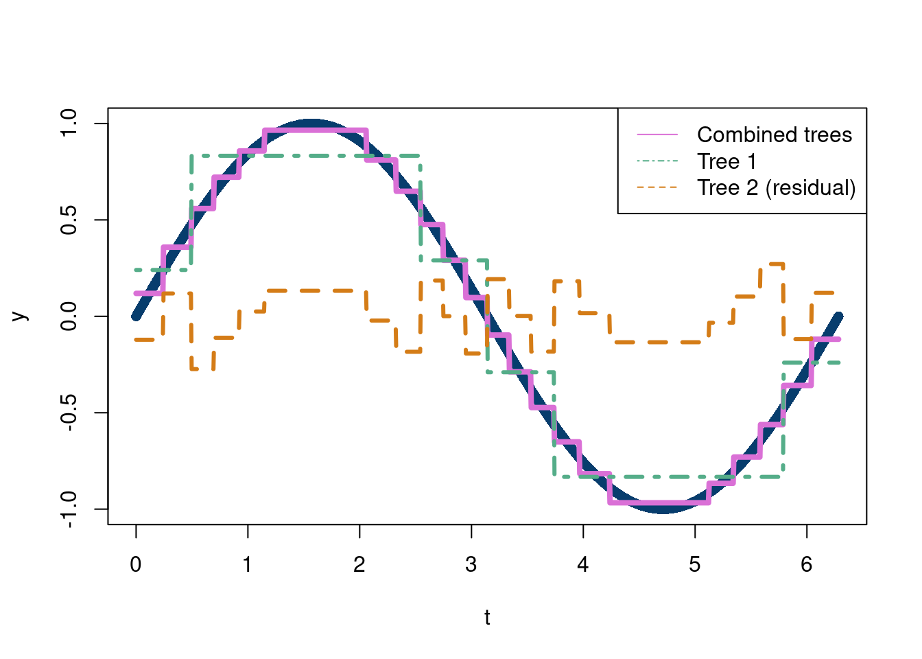 legend('topright',c('Combined trees', 'Tree 1', 'Tree 2 (residual)'),