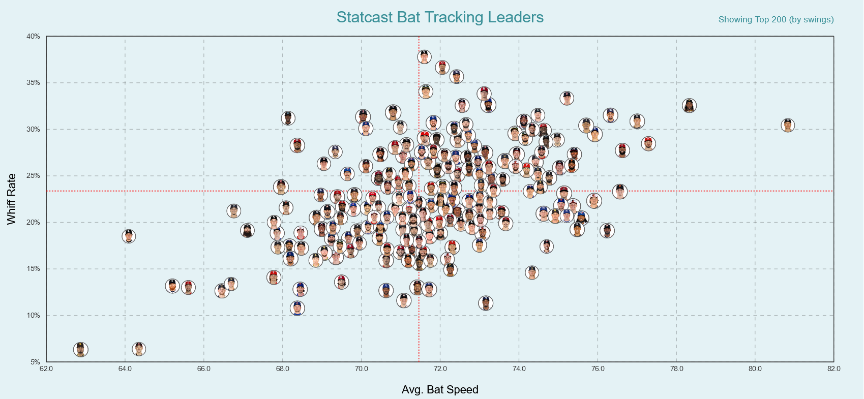 In the previous paragraph, we focused on the case where we modeled things well but things outside the model prevented it’s widespread use and adoption. But what if the modeling itself wasn’t up to snuff? And not in an obvious way that you could learn in a course? Instead, we want to emphasize that the modelling stage of an analysis may cause active harm! With an over reliance on predictive modeling (machine learning) and a sometimes lacking understanding of the underlying situation, erroneous results can spurt. For example (courtesy of Demetri’s time in Houston), this fangraphs article estimates the effect of swing speed on players strike-out rates. A preliminary analysis shows that average bat speed correlates strongly with strikeout rates. Cool insight! Right? Not so fast. This is not accounting for the fact that the bat slows down when a player makes contact, so well yeah! To complicate things further, even when accounting for that, players who swing harder do whiff more! See Figure 1.2 and Figure 1.3.
