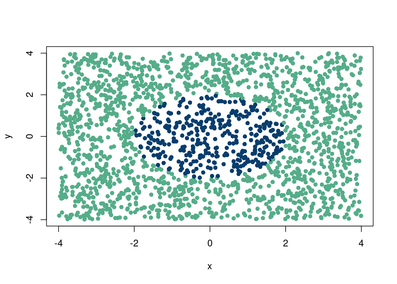 r =4N =2000inside <-numeric(N) #only zeroes removed , x <-runif(N, min =-r, max = r) # removed ,y <-runif(N, min =-r, max = r) # removed ,inside <-ifelse(x^2+ y^2<= r, 1, 0)colorz=ifelse(inside==1, '#073d6d', '#55AD89')plot(x, y, col=colorz, pch=16)