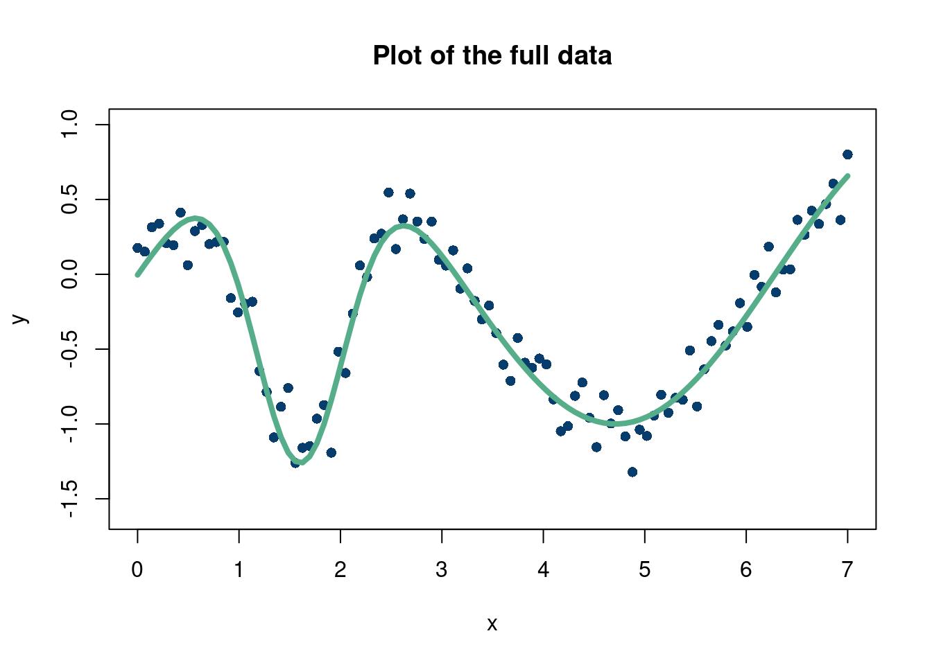 options(warn=-1)suppressMessages(library(stochtree))suppressMessages(library(gganimate))suppressMessages(library(tidyverse))suppressMessages(library(dplyr))num_gfr <-20num_burnin <-10num_mcmc <-100num_samples <- num_gfr + num_burnin + num_mcmcRMSE <-function(m, o){sqrt(mean((m - o)^2))}# start with 10 points randomly selecteddesign_init =10N =100set.seed(12024)RMSE_list =matrix(NA, nrow=50, ncol =1) fsindn <-function(x)sin(x) -2.55*dnorm(x,1.6,0.45)# consistent X X =matrix(seq(from=0, to=7, length.out=N)) X_full = X y <-fsindn(X) +rnorm(length(X), sd=0.15) first_guess =sample.int(nrow(X), design_init)# The dataplot(X, y, xlab="x", ylab="y", ylim=c(-1.6,1),col='#073d6d', pch=16, cex=1, main='Plot of the full data')lines(X, fsindn(X), xlab="x", ylab="f(x)", ylim=c(-1.6,1),col='#55AD89',lwd=4, pch=16, cex=0.75, main='True function without noise')