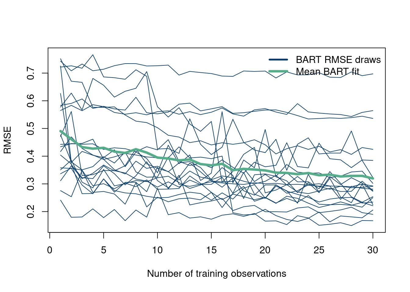 suppressMessages(library(stochtree))num_gfr <-10num_burnin <-100num_mcmc <-50num_samples <- num_gfr + num_burnin + num_mcmcRMSE <-function(m, o){sqrt(mean((m - o)^2))}# start with 10 points randomly selecteddesign_init =10N =100num_rep =20RMSE_list =matrix(NA, nrow=30, ncol = num_rep)GP_RMSE =matrix(NA, nrow=N-design_init, ncol = num_rep)for (M in1:num_rep){ fsindn <-function(x)sin(x) -2.55*dnorm(x,1.6,0.45)# consistent X X =matrix(seq(from=0, to=7, length.out=N)) X_full = X y <-fsindn(X) +rnorm(length(X), sd=0.15) first_guess =sample.int(nrow(X), design_init)# For plotting purposesBART_fit =c()next_step =c()X_train_sub =c()y_train_sub =c()for (k in1:30){# remove these X'snew_X =setdiff(seq(from=1, to=nrow(X)), first_guess)# your initial X'sX_train =as.matrix(X[first_guess,])X_test = X_full#as.matrix(X[new_X,])y_train = y[first_guess]y_test = y#[new_X]bart_model_warmstart <- stochtree::bart(X_train = X_train, y_train = y_train, X_test = X_test, num_gfr = num_gfr, num_burnin = num_burnin, #alpha=0.995, beta=1.25,num_mcmc = num_mcmc, general_params =list(sigma2_global_init =1e-2, sigma2_global_scale =1e-3),mean_forest_params =list(num_trees =100,min_samples_leaf=1, sigma2_leaf_init=1e-1,sigma2_leaf_shape =6, sigma2_leaf_scale =0.25))# the maximum of f up until nowf_max =max(rowMeans(bart_model_warmstart$y_hat_train))EI =sapply(1:length(new_X), function(j) (1/num_mcmc)*sum(sapply(1:num_mcmc, function(i)max((bart_model_warmstart$y_hat_test[j,i]+bart_model_warmstart$sigma2_global_samples[i]*rnorm(1)-f_max),0))))most_improved = new_X[which(EI==max(EI))]if(length(most_improved) >1){ most_improved <-sample(most_improved, 1)}first_guess =c(first_guess, most_improved)RMSE_list[k, M] =RMSE(rowMeans(bart_model_warmstart$y_hat_test), y_test)}}matplot(RMSE_list, type='l', col='#073d6d', lwd=1, ylab='RMSE', xlab='Number of training observations', lty=1)matpoints(rowMeans(RMSE_list), type='l', lwd=4, col='#55AD89')legend("topright", c("BART RMSE draws", "Mean BART fit"), col=c('#073d6d', '#55AD89'), lty=c(1,1),bty="n", lwd=c(3,4))