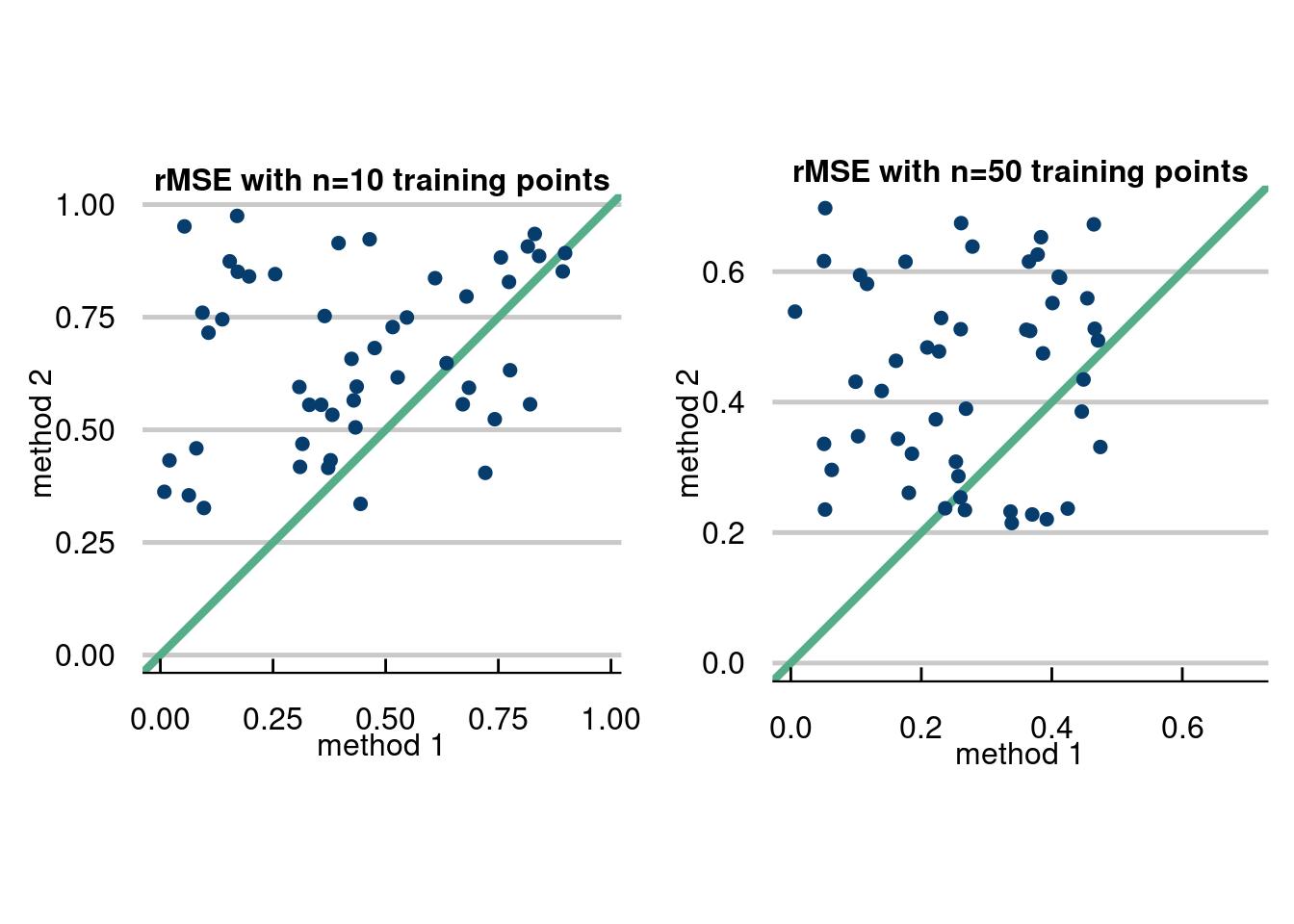 The first method is a way to visualize when you have ran multiple experiments and had an evaluation metric for each experiment, like the root mean squared error. The idea is to plot the RMSE for method 2 vs method 1 for each experiment and compare which are better. We will show how with a simulated data example below.
