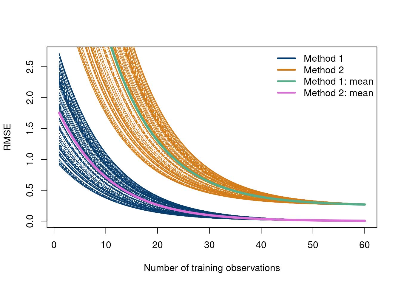 How about looking at the RMSE for different training sizes comparing all \(MC\) Monte Carlo experiments. The data are simulated, but are meant to represent exponentially decreasing RMSE values.