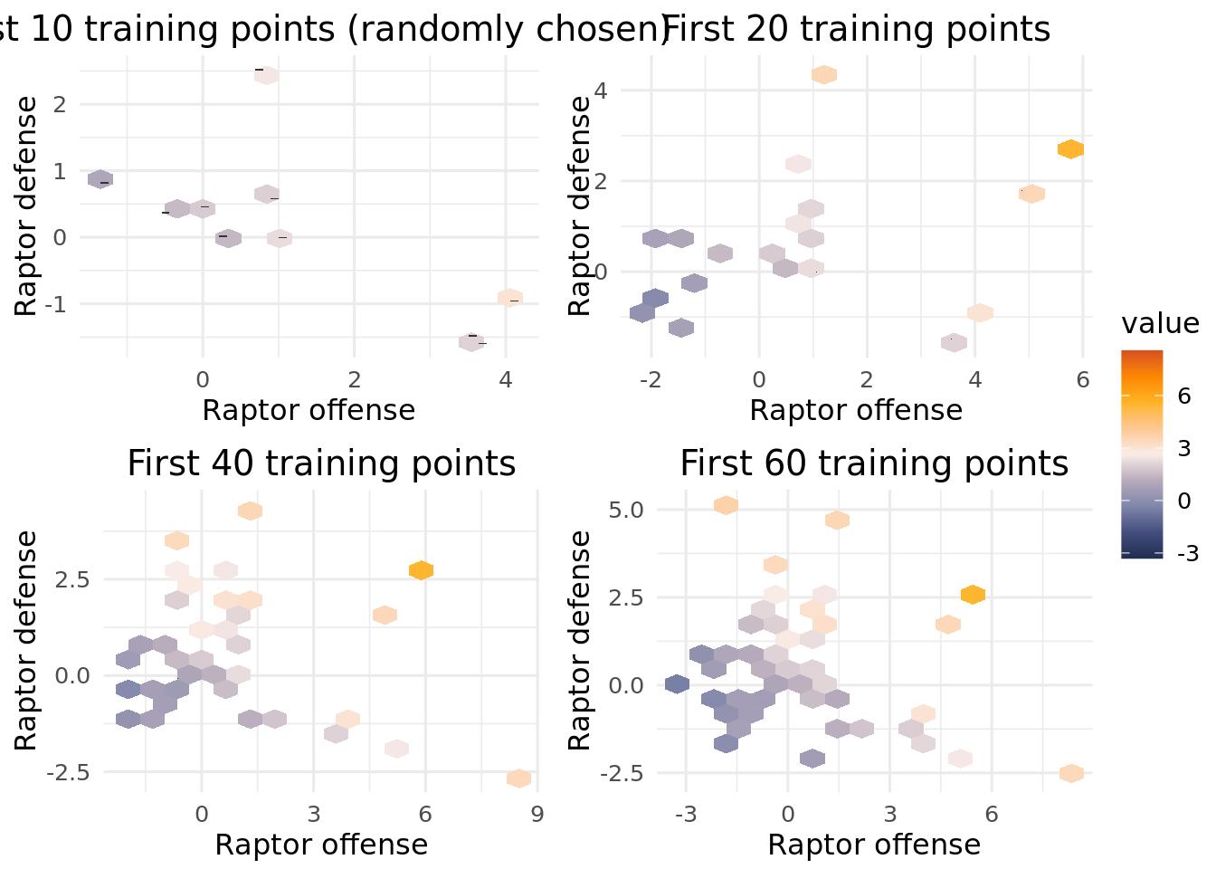 The natural question to ask is if following the uncertainty given from BART and the expected utility criterion is leading us to better regions of the 2-D offense/defense “design space” sooner or if BART is just a really good surrogate (particularly for this easy, noiseless example). Instead of using the expected improvement criteria for the next sampled point in your design matrix, randomly sample a point and see how quickly BART recovers a good approximation of the true output.