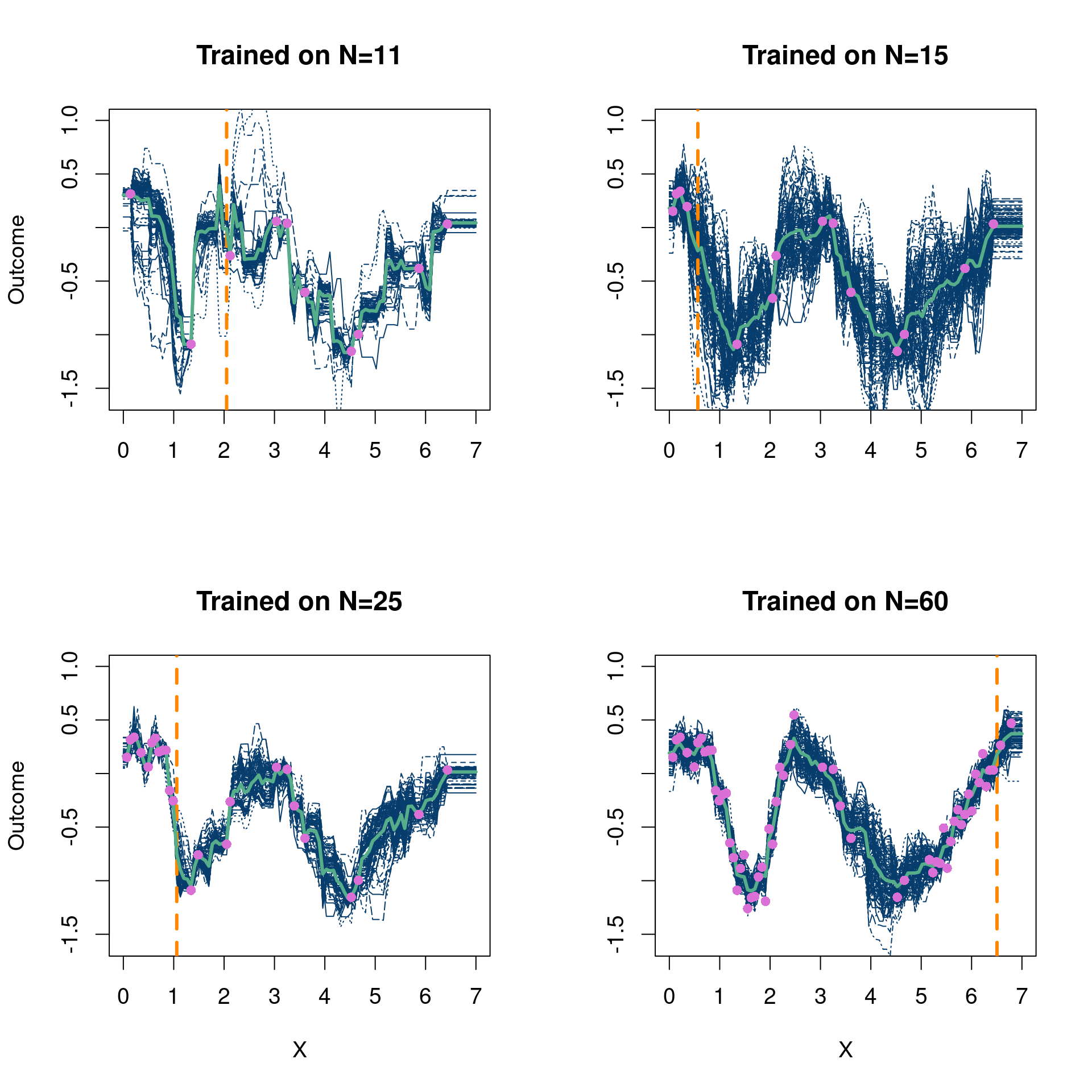 Now, we repeat the experiment 20 times just to make sure this particular set of Monte Carlo draws were not just an easy realization of the DGP. This is fairly easy, as it just requires wrapping the inner loop with one outer loop. Just so it does not take too long, we only do 20 repetitions (with only 10-40 training points to save compute time), but crank this number up.