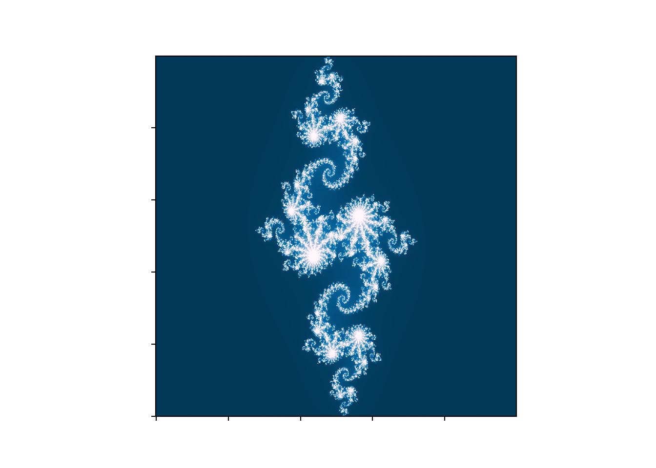 import numpy as npimport timefrom numpy import zerosimport scipy.miscimport matplotlib.pyplot as pltimport matplotlibfrom matplotlib import animationimport randomfrom random import randintimport warnings# Comment this line out when you run it locallywarnings.filterwarnings("ignore")plt.rcParams['animation.ffmpeg_path'] ='ffmpeg'starttime=time.time()#### Vary z, keep c constant #####plt.imshow(mandelbrot(xpts+1j*ypts, -0.70176-0.3842j), cmap='RdBu', origin='lower')def mandelbrot2(z, c): empty=np.zeros((xpts.shape[0],ypts.shape[1]))for i inrange(225):#225 is arbitrary, but seems to get the job done, 225 times to escape#i believe 256 is when you get to optimal range, but this saves run time#especially if you have big grid z=z**2+c #run num times to see if z exceeds set boundary empty[abs(z)<2]+=1#empty= abs(z) < 1 #if z is bigger than boundary, return truereturn(empty) #run through all c values because we use grid# set Ngrid higher for better resolution# right now, its the number in front of jxpts, ypts = np.ogrid[-1.5:1.5:500j, -1.9:1.9:500j]fig,ax = plt.subplots(1)XX=mandelbrot2(xpts+1j*ypts, -0.8+.156j)# Make your plot, set your axes labelsax.imshow(XX, cmap='PuBu_r', origin='lower')ax.set_ylabel('')ax.set_xlabel('')# Turn off tick labelsax.set_yticklabels([])ax.set_xticklabels([])#plt.imshow(mandelbrot(xpts+1j*ypts, -0.8+.156j), cmap='PuBu_r', origin='lower')#plt.gca().axes.get_yaxis().set_visible(False)#plt.gca().axes.get_xaxis().set_visible(False)#change z for julia sets, change c for iconic one#plt.xlim(-.6,.6)#plt.ylim(-1, .25)#plt.savefig('newmandel.pdf')plt.show()